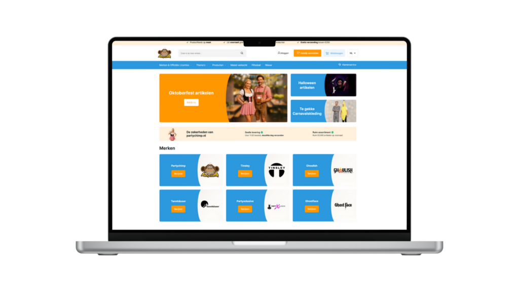 Voor Partychimp.nl ontwikkelden we een B2B-webshop met klantspecifieke prijzen en accounts, gebaseerd op Oktoberfestwinkel.nl.